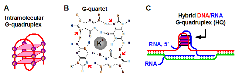 除了雙鏈配對的雙螺旋結構以外,DNA可以形成一些更高級的結構比如G四鏈體(G-quadruplex,圖A)。G四鏈體是一種四鏈結構並且由二層以上鳥嘌呤平麵組成,每個鳥嘌呤平麵含有4個相互氫鍵配對的鳥嘌呤堿基(圖B)。端粒DNA的TTAGGG序列可以形成由3層鳥嘌呤平麵組成的分子內G四鏈體結構,這種結構形成可以阻擋端粒酶對端粒的延伸。除了端粒DNA以外,越來越多的可以形成G四鏈體的DNA序列在人和其他物種基因組中被發現。利用生物信息學的方法,人們發現G四鏈體形成序列在基因組中分布的頻率高,而且其分布位置也很有規律,比如癌基因的啟動子以及轉錄起始區。