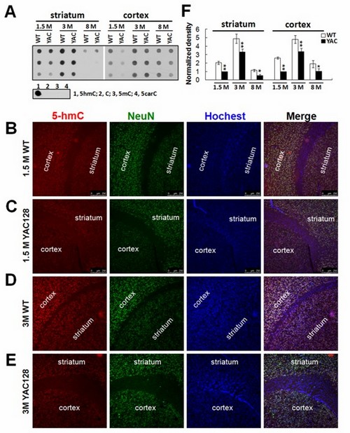 亨廷頓氏舞蹈病是一種常染色體顯性遺傳的神經退行性疾病,其主要病理特征是大腦紋狀體神經元的漸進性死亡。亨廷頓基因突變導致紋狀體神經元選擇性死亡的機製還不清楚,目前也沒有任何治療手段。DNA胞嘧啶的甲基化修飾是一重要的表觀修飾方式,在染色體結構重塑、基因沉默、發育與分化等過程中扮演著關鍵角色。最近有研究結果證實,胞嘧啶的甲基化可被進一步氧化為羥甲基化修飾,有證據顯示胞嘧啶羥甲基化修飾(5hmC)在胚胎發育和胚胎幹細胞的增殖分化、神經細胞的分化成熟中有重要作用。關於DNA的5hmC修飾與神經退行性疾病的關係還未見報道。