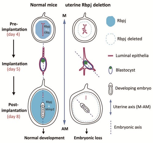 進一步通過體外生化實驗、notch通路轉基因小鼠模型以及藥理實驗發現:RBPJ在植入前的子宮中通過與雌激素受體 (ERα) 結合,調節雌激素效應基因的表達進而促使子宮腔從分支樣結構變為狹縫狀。RBPJ缺失的子宮腔由於保留多餘的分支(與子宮軸方向不一致),形成一個個“陷阱”,落入這些“陷阱”的胚胎由於建立了錯誤的發育軸向而走向死亡。 此外,研究組還進一步發現RBPJ在植入後的子宮中通過轉錄調控基質金屬蛋白酶(MMP)的表達對子宮基質蛻膜進行改造,使子宮蛻膜的改造進程與胚胎軸向的延伸協調同步。這些證據表明RBPJ對圍植入期的子宮進行階段特異的改造,實現植入期胚胎的正確定向以及植入後蛻膜期的正常發育。