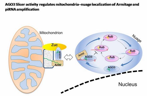 陳大華實驗室研究發現AGO3的Slicer活性對piRNAs的次級擴增非常重要,AGO3以不依賴Slicer活性的方式抑製AUB:AUB乒乓循環。他們進一步研究發現AGO3的Slicer突變體導致piRNAs初級加工蛋白Armitage的異位表達。作為piRNAs初級加工途徑的重要成員,Armitage蛋白通常出現在細胞質和線粒體上,但AGO3的Slicer突變體導致Armitage蛋白出現在piRNAs次級加工場所nuage細胞器上。重要的是,研究發現AGO3和Armitage存在相互作用並同時定位於線粒體。此外,AGO3也與另一種線粒體蛋白Zucchini存在相互作用,由此調控AGO3/Armitage複合體在線粒體與nuage之間動態地穿梭,並在nuage上共同參與AGO3 RISC複合體的組裝。該研究提出線粒體和nuage共同調控piRNA的次級加工的觀點,為進一步深入理解piRNA的發生的機製提供理論依據。該研究成果於7月21日發表於Journal of Cell Biology。
