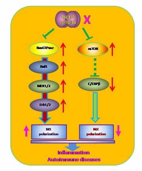 巨噬細胞功能極化對機體抗病原菌感染及損傷修複的質量和效率具有重要作用。巨噬細胞有不同的極化方式,如機體遇到細胞內病原微生物感染時,巨噬細胞會表現出經典型極化(M1)並表達相應的促炎因子TNF-α、IL-12及iNOS來清除病原微生物。而當機體遇到細胞外病原微生物如寄生蟲感染或過敏原等刺激時,巨噬細胞發生替代激活(M2)並表達Arg1,Ym1及Fizz促進寄生蟲的清除,促進組織修複及肉芽腫和過敏性哮喘。因此,巨噬細胞的極化的精確調控對維係機體健康十分重要。TSC1/2-mTOR通路是細胞內重要的信號通路,對調控細胞生長、發育及細胞代謝過程具有重要作用。我們應用髓係特異缺失TSC1基因的小鼠(TSC1KO)研究發現,TSC1KO小鼠隨著年齡的增長而自發患有嚴重自身免疫性疾病,並且該小鼠對內毒素炎性休克十分敏感,亞致死劑量的LPS可導致該小鼠死亡。實驗結果表明,LPS或LPS聯合IFN-γ誘導TSC1KO巨噬細胞產生大量的促炎因子TNF-α、IL-12及iNOS,表現出更強的M1型巨噬細胞極化。生化與分子生物學研究證明,TSC1 缺失引起的M1型極化增強是通過mTOR非依賴的TSC1/2-RasGTPase-Raf-MEK-Erk通路調控的。此外,體內外實驗表明,TSC1KO的巨噬細胞存在抗炎性M2型極化能力缺陷,表現為對IL-4刺激後低表達M2的標誌分子Arg1、Ym1和Fizz,TSC1KO小鼠對OVA誘導的哮喘具有抗性。進一步研究表明,TSC1是通過調節mTOR依賴的C/EBPβ的表達來調控巨噬細胞M2型極化。因此,TSC1/2蛋白複合體通過不同的信號通路來調控巨噬細胞的極化,從而調控巨噬細胞的內穩態,抑製巨噬細胞炎性反應,避免自發炎性疾病的發生。該研究為臨床治療巨噬細胞相關免疫性疾病的防治提供了新的思路。該研究成果於2014年9月在線發表於Nature Communications(http://www.nature.com/ncomms/2014/140901/ncomms5696/full/ncomms5696.html)。動物所朱琳楠及楊濤博士為共同第一作者,趙勇研究員為通訊作者。該研究與協和張宏冰和張連峰教授及南京大學楊中州教授合作完成。此課題得到了科技部和國家自然科學基金委資助。