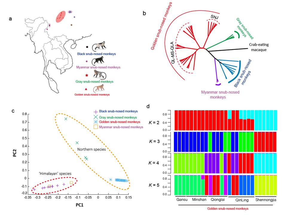 圖1:金絲猴屬係統發育關係及種群遺傳結構