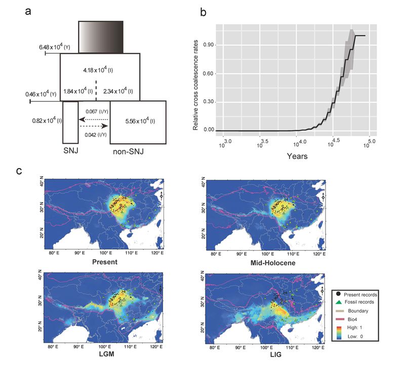 該研究結果顯示金絲猴的遺傳多樣性低於其他靈長類物種,而接近與一些瀕危食肉類(例如非洲獅、雪豹等)。係統發育重建和遺傳結構分析顯示川金絲猴主要有兩個遺傳簇(分布由神農架種群和秦嶺-岷山-邛崍等山係種群組成),暗示其應該作為獨立遺傳管理單元,以及秦嶺種群與岷山- 邛崍等種群間有較強的基因交流。PSMC模型也顯示不同山係類群之間有效種群大小波動趨勢不盡相同。而結合古氣候數據的SDM模型模擬則表明金絲猴的分布區變遷與氣候之間存在緊密的關係。比較有趣的是,在相對寒冷的LGM時期,雖然SDM模型顯示生境偏向較為溫暖的南方,但化石記錄則顯示這一時期金絲猴卻遷移向較寒冷的亞洲北部區域,而基因組數據也顯示這一時期川金絲猴經曆過嚴重的瓶頸效應。