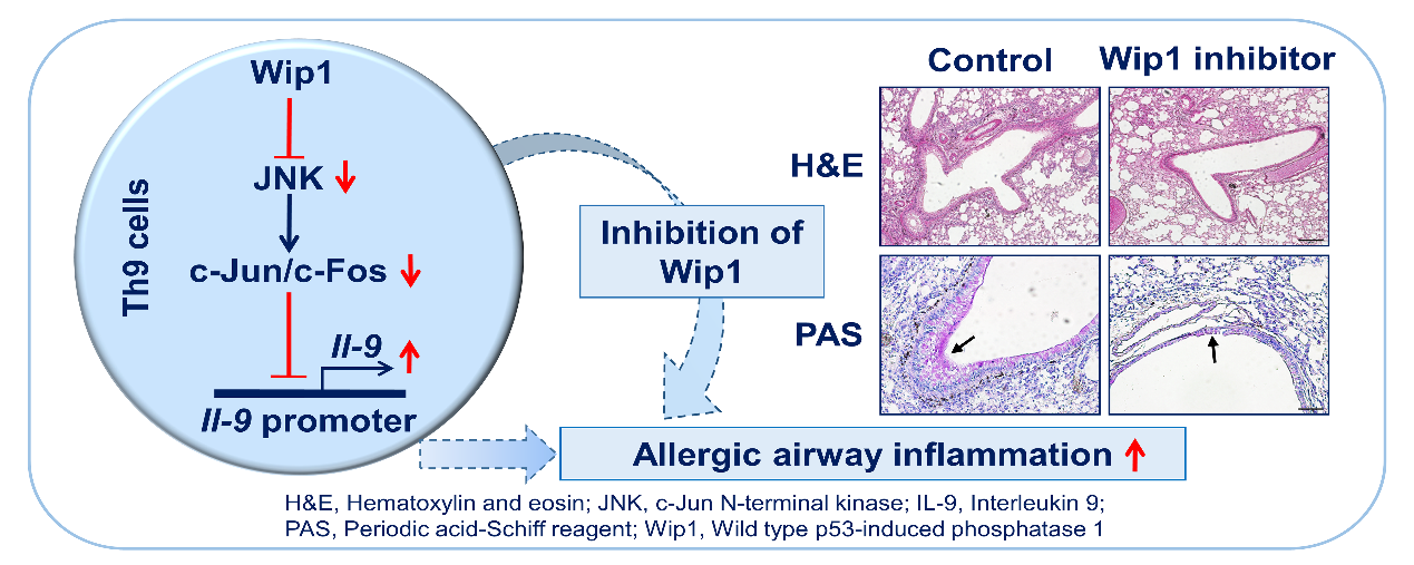 張連鋒教授合作研究發現, Wip1對Th9細胞的發育分化及小鼠過敏性哮喘發病過程中發揮重要作用。研究發現,Wip1基因缺失T細胞發育分化為Th9細胞及其產生IL-9的能力顯著缺失。分子機製研究證明,Wip1主要通過JNK-c-Jun/c-Fos分子通路直接影響Th9細胞的分化和Il-9的表達。過敏性哮喘小鼠實驗模型結果證明,Wip1基因缺失小鼠的肺部浸潤的嗜酸性粒細胞的比例和數目顯著減少,肺部病理程度顯著減輕。重要的是,在過敏性哮喘小鼠模型誘導過程中,使用Wip1抑製劑可以顯著降低小鼠的過敏病理變化。該研究表明,Wip1可能作為一個治療過敏性哮喘或其他過敏性疾病的重要藥物靶點,Wip1抑製劑最為治療Th9介導的相關疾病具有潛在的臨床應用前景。