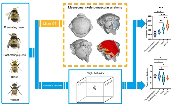 昆蟲胸部作為飛行功能的核心結構,其外骨骼與特化的飛行肌係統通過直接和間接兩種機製協同驅動翅運動。然而,現有研究往往將形態學特征(如肌肉排列、骨片結構)與飛行運動學參數(如振翅頻率、運動軌跡)割裂分析,缺乏係統性的功能形態學整合研究。以我國重要的傳粉物種蘭州熊蜂(Bombus lantschouensis)為例,其蜂群中存在顯著的社會分工:具有繁殖功能的蜂後(queen)、負責采集的工蜂(worker)以及專司交配的雄蜂(male),這種社會性差異可能導致不同類群在飛行器官形態和飛行行為上產生適應性分化。