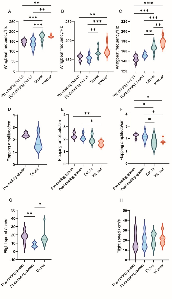 圖3 不同類型的蘭州熊蜂在不同飛行模式中的運動參數。(A,D,G)起飛;(B,E)懸停;(C,F,H)前飛。