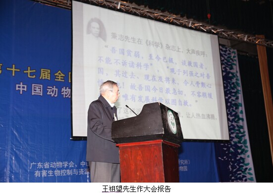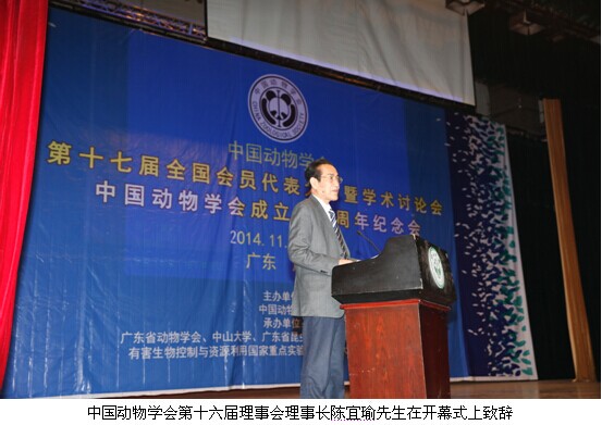 中國動物學會第十七屆全國會員代表大會暨學術討論會、中國動物學會成立八十周年紀念會,於2014年11月17-20日在廣州市中山大學隆重舉行。會議由中國動物學會主辦,廣東省動物學會、中山大學、華南瀕危必威在线网址 (廣東省昆蟲研究所)、有害生物控製與資源利用國家重點實驗室(中山大學)和廣州動物園共同承辦。來自全國29個省、市、自治區及香港地區的中國動物學會會員、動物學界的專家、學者及相關領域的科技工作者、學生代表、工作人員等近700人歡聚一堂,共同慶祝中國動物學會成立八十周年並進行學術交流。中國動物學會理事長陳宜瑜院士,中山大學黨委書記鄭德濤,中山大學副校長黎孟楓,中國科協學會學術部巡視員顏利民,廣東省科協黨委書記何真,中山大學生命科學大學院副院長鄭利民,廣東省動物學會理事長、中山大學海洋學院院長何建國,廣東省科協學會學術部部長錢春,中國科學院廣州分院、廣東省科學院副院長李定強,中國科學院院士鄭光美、朱作言、孟安明、金力、桂建芳,中國工程院院士林浩然、馬建章等,95歲高齡的老理事王所安先生、中國動物學會的第十四屆理事會理事長陳大元,以及部分老專家如馬逸清、周開亞、曹玉萍、楊竹舫、袁喜才等到會。會議分為中國動物學會成立80周年紀念、會員代表大會和專題學術交流三部分,會議共收到論文摘要398篇。
