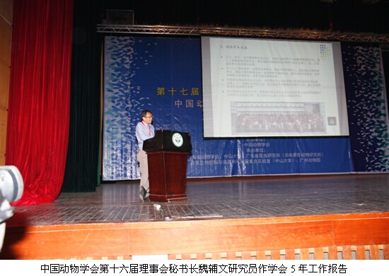 大會開幕式由中國動物學會常務副理事長孟安明院士主持,中山大學副校長黎孟楓,廣東省科協黨組書記、副主席何真,廣州動物園園長劉立軍,中國動物學會理事長陳宜瑜院士等分別致辭。會員代表審議通過了魏輔文秘書長作的第十六屆理事會工作報告和財務報告,審議通過了王小明副理事長作的學會章程修改報告和會員會費標準等。代表大會上,會員代表通過無記名投票方式選舉產生了中國動物學會第十七屆理事會123名理事。