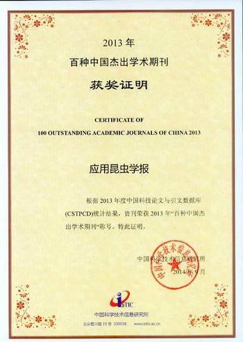 中國科學技術信息研究所每年出版的《中國科技期刊引證報告》(核心版)發布中國科技論文與引文數據庫收錄的中國科技論文核心期刊的二十餘項科學計量指標,並從1999年開始以此基礎,研製了中國科技期刊綜合評價指標體係,采用層次分析法,由專家打分確定了重要指標的權重,並分學科對每種期刊進行綜合評定。2002年公布了第一屆百種中國傑出學術期刊名單,自此之後,連續每年公布百種中國傑出學術期刊。2014年度的評選結果最近揭曉,《應用昆蟲學報》入選2013年百種中國傑出學術期刊。
